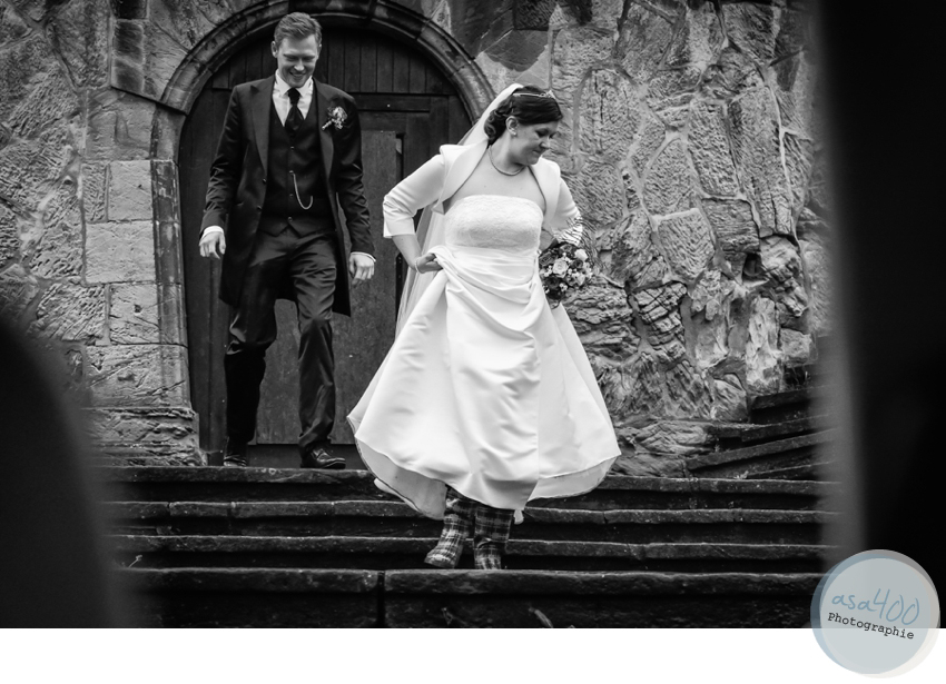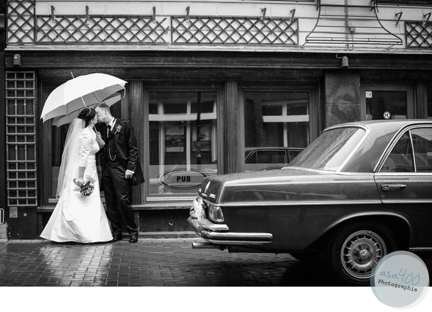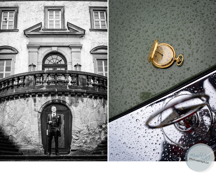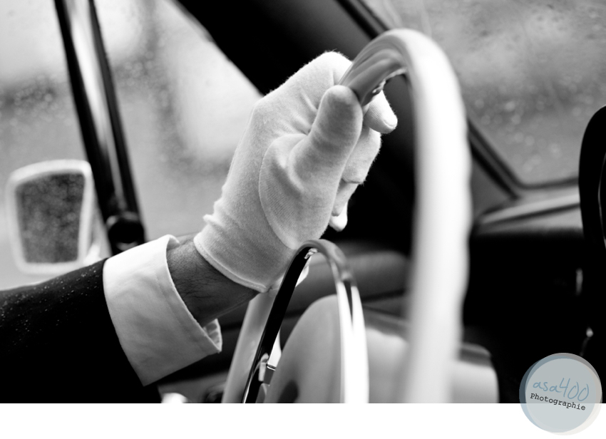Doch Agnes & Philipp störte das Wetter kaum. Nach einer wunderschönen Trauung in der St.Marienkirche in Salzgitter Bad wurden sie schließlich ganz bequem, elegant  und trocken (!) von ihrem Chauffeur Falko in einem alten Mecedes-Benz SE 280 zur  Location gebracht. Und auch beim Holzsägen und Anstoßen mit ihren Gästen musste niemand nass werden. Agnes & Philipp haben sich einfach nicht aus der Ruhe bringen lassen und schließlich findet man beim Fotoshooting immer auch ein trockenes Plätzchen. Und Fotos von der Braut in Gummistiefeln haben eben auch etwas ganz Besonderes.