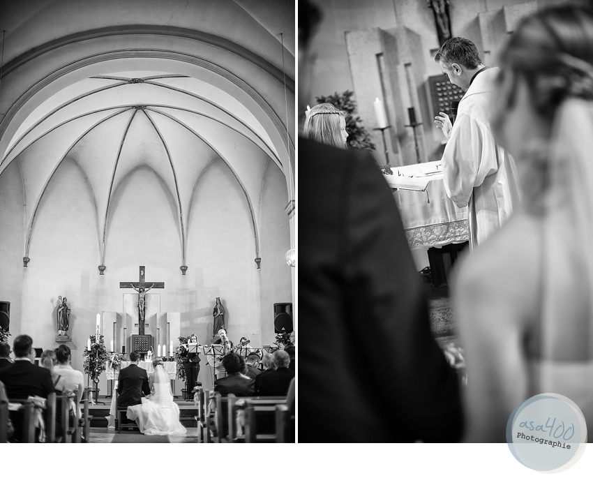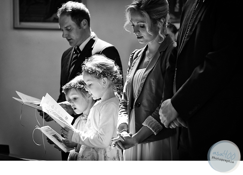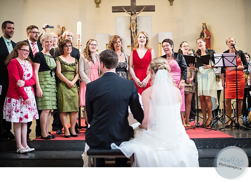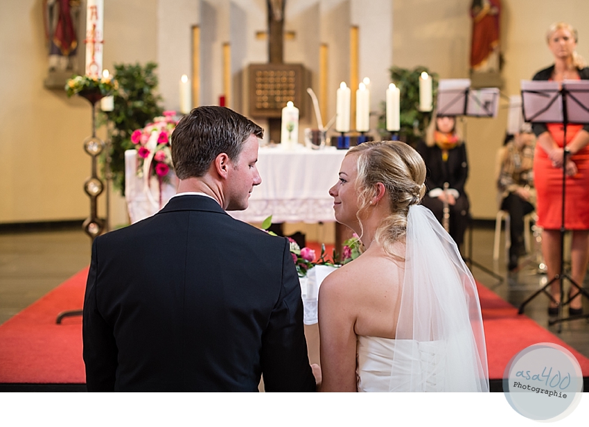 Anschließend empfingen Jennifer & Henrik ihre Gäste mit Sekt und Häppchen, um dann gemeinsam in die Pfarrkirche in Ottbergen einzuziehen. Eigentlich war es eine ungewöhnliche Abfolge des Hochzeitstages, aber der Romantik hat es nicht geschadet – es ist einfach soo schön als Hochzeitsfotograf ganz weit vorne mit dabei zu sein und die kleinen glitzernden Tränchen zu sehen! 🙂 Jennifer & Henrik gaben sich das Eheversprechen vor ihrer Familie und ihren Freunden und bekamen dafür glatt ein Versprechen zurück! I’ll be there – wunderschön gesungen! Das war einfach großartig!