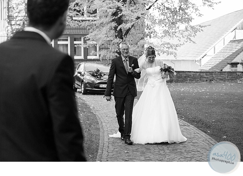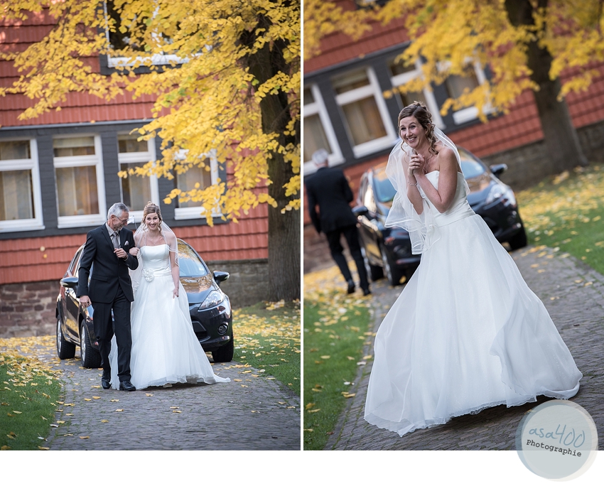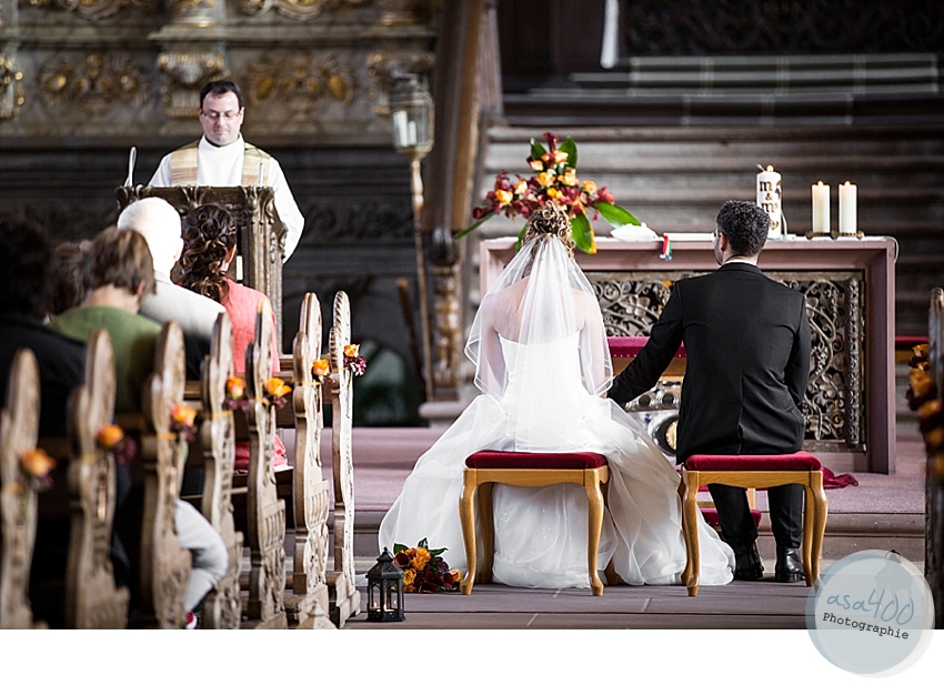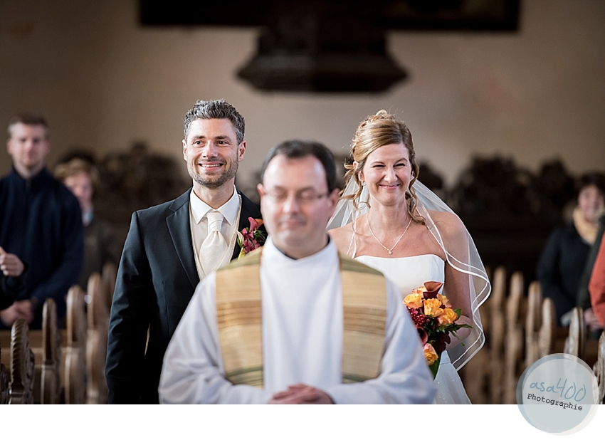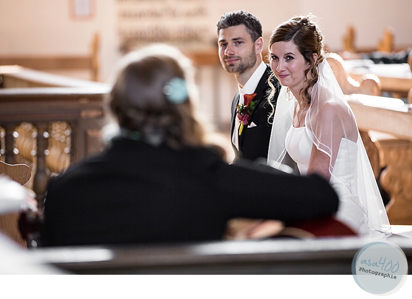 Martin begrüßte in der Zeit schon die ankommenden Gäste und wartete aufgeregt auf seine Braut. Die Herbstkälte ließ sich Mareike nicht anmerken, sie war eine wunderschöne Braut und während alle anderen in der Kirche warteten, durften wir bei ihrem Zusammentreffen vor der Kirche dabei sein. Die Trauung wurde von wunderschöner Musik untermalt und Mareike & Martin gaben sich vor ihrer Familie und ihren Freunden das Ja-Wort. Und obwohl die Beiden schon viele Jahre auf gemeinsamer Reise sind, beginnt mit diesem Tag doch irgendwie ein neues Kapitel, eine neue Reiseroute.