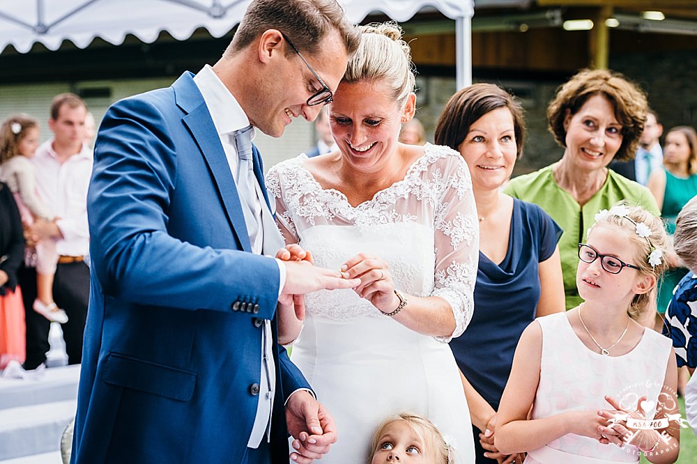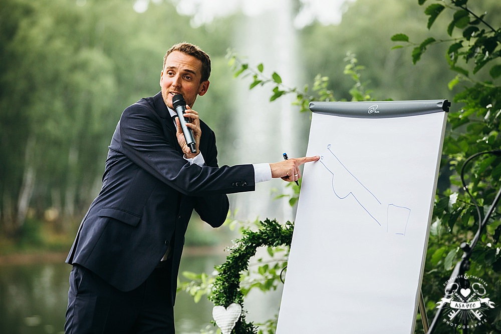 Und gleich danach begann die bezaubernde freie Trauung der Beiden. Auf weißen Bänken, unterm freien Himmel, mit direktem Blick auf den See… Ein Freund des Brautpaares traute die Beiden. Eigentlich perfekt, denn wer kennt einen besser als ein guter Freund der Familie!? Seine Worte trafen mitten ins Herz! Er sprach von Liebe, Respekt, gegenseitiger Fürsorge, Familienritualen und … Physik. Und so lernte die Hochzeitsgesellschaft (und auch wir) neue Tischsprüche kennen und auch etwas über das Phänomen der Brachistrochrone. Denn auch die Kurven des Lebens führen zum Ziel, manchmal sogar schneller als der direkte Weg…