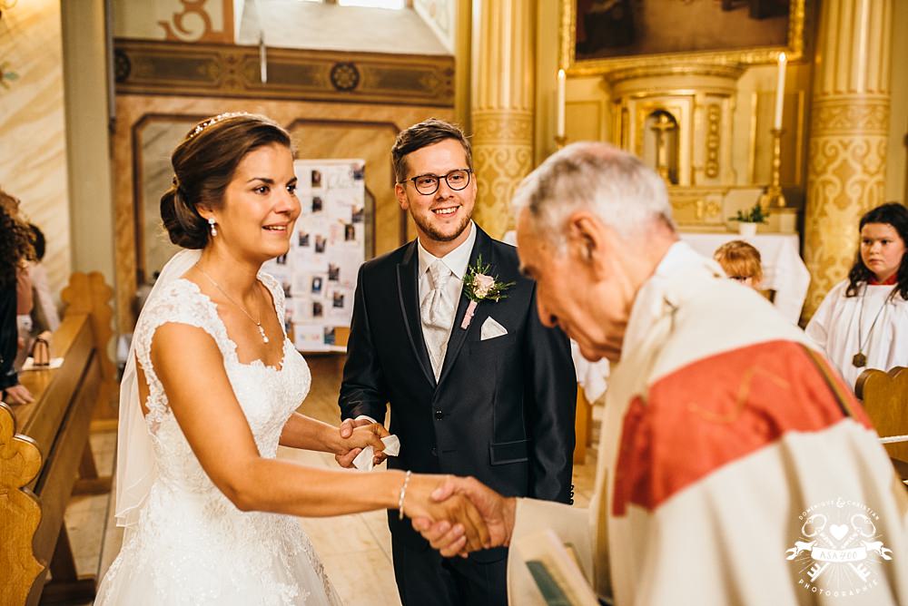 Nach der Trauung erwarteten das Paar die ersten Überraschungen des Tages. Und es durfte geherzt und gratuliert werden. Natürlich wurden auch Erinnerungsfotos von der Hochzeitsgesellschaft gemacht.