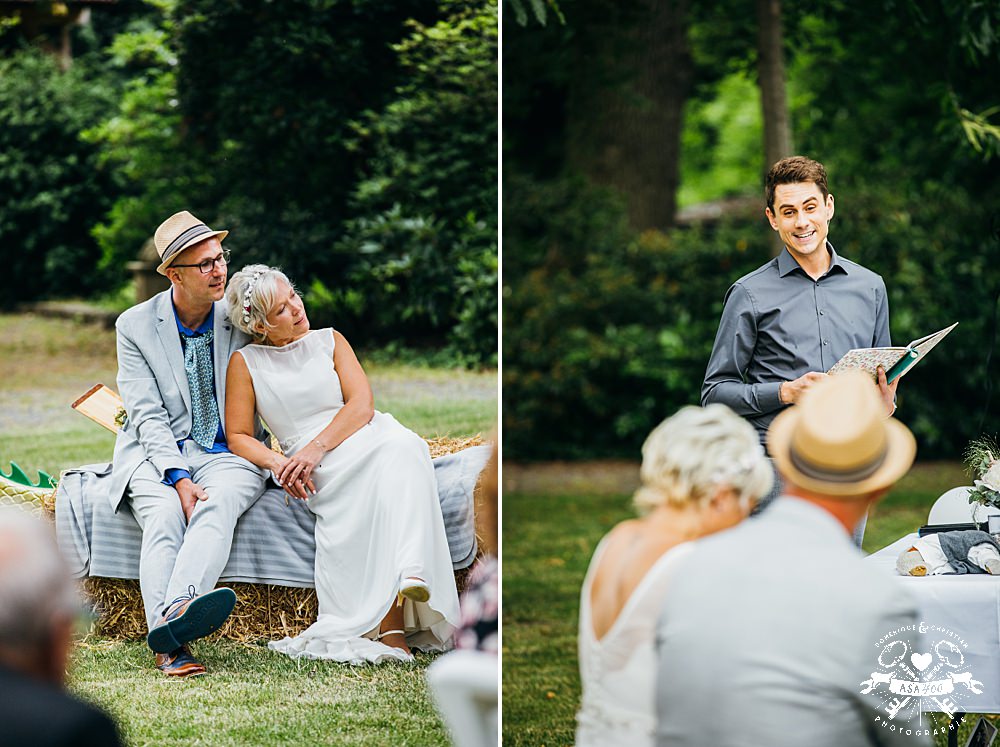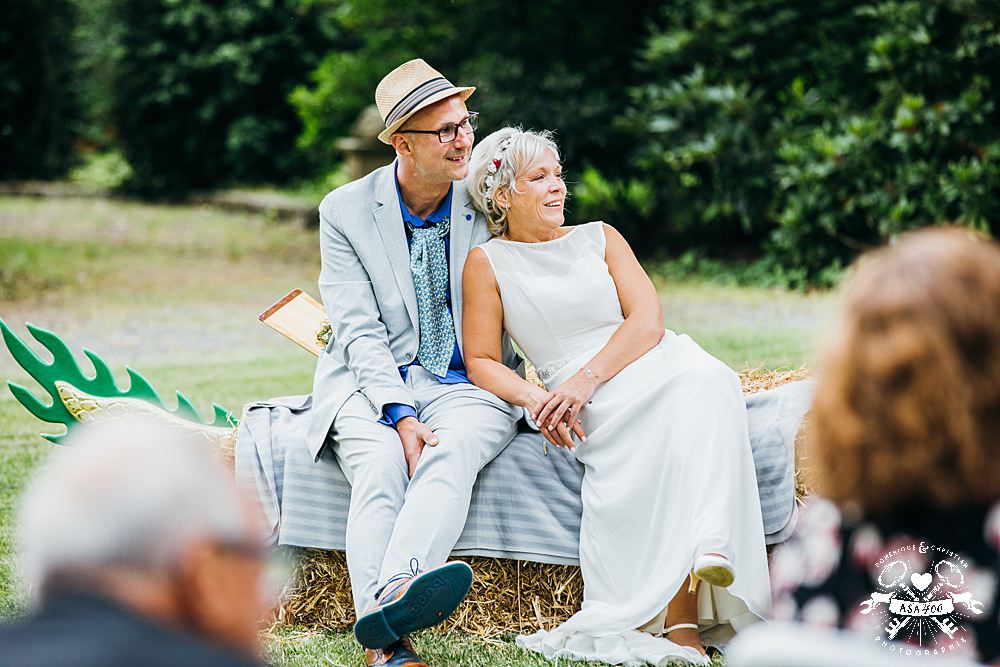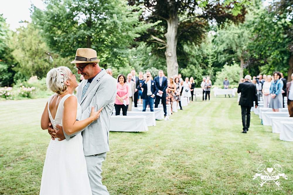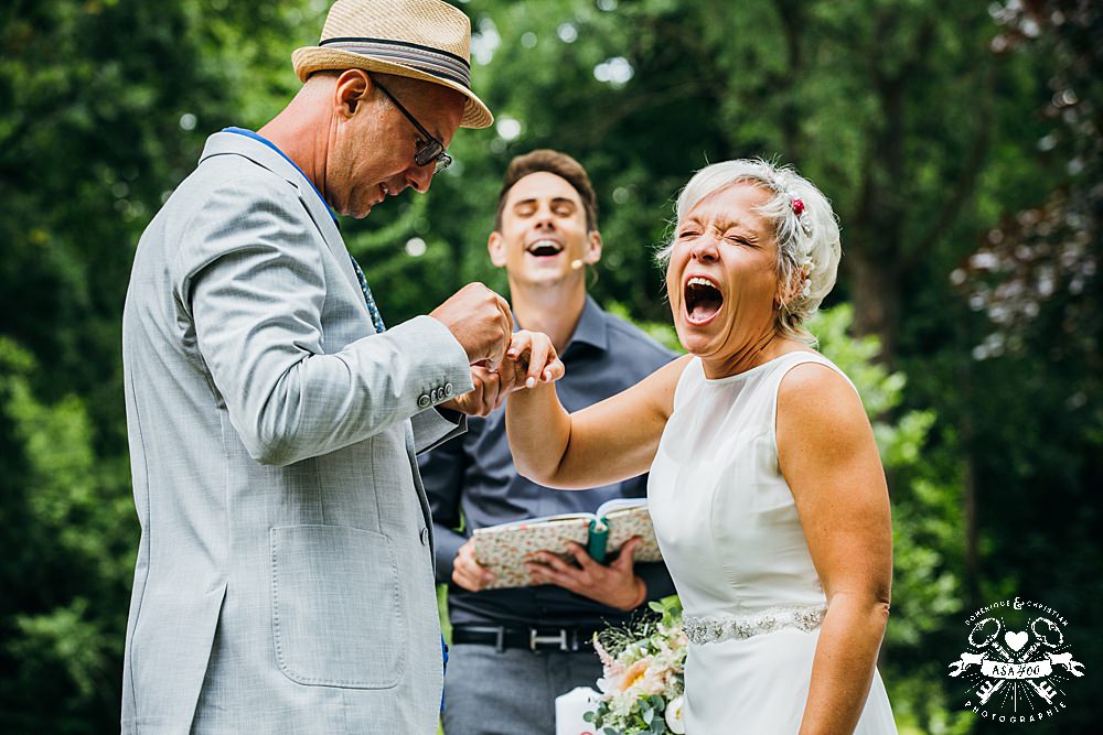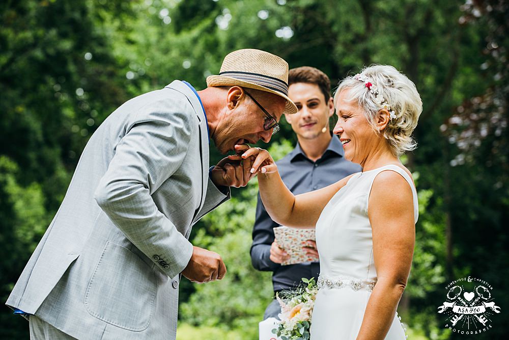 Wuschel wurde von ihrem Vater zu Tommy begleitet und ab diesem Zeitpunkt sprühten die Funken zwischen ihnen. Was folgte waren wundervolle Worte des Trauredners Pat, Wünsche ihrer Liebsten, ein ganz besonders geliebter Ringträger und ein feucht-fröhlicher Ringwechsel, den wir so in 10 Jahren Hochzeitsfotografie noch nicht erlebt haben.